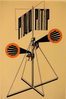 Such structures remain somewhat enigmatic. Overtly, their function is to serve the didactic requirements of the state. They have been criticised for not inviting an engaged audience: for instance, Victor Margolin suggests that Rodchenko’s positioning of a clock on his tall kiosk suggests regulation and with its screens and loudspeakers, he argues that the only part of Rodchenko’s design that allows a dialogic engagement is the part that sells newspapers and books. Writing in 1997, he asserts that such designs have been discussed in terms of their ‘formal experiments’ but not their ‘political implications’ , which he argues comprise ‘a subordinate relationship of the Soviet citizen to state power’ through their ‘concentration of one-way information sources’ (1997:18-19). Similarly inflected criticisms of Klutsis’s kiosks are made by Klemens Gruber, who suggests that they resemble illustrations for ‘Walter Benjamin’s notes on the stage of the epic theatre’, except that they ‘make the human element superfluous’ and confront us, instead, with ‘a staging of the apparatus, which replaces man – while the technology itself becomes capable of speaking’ (Gruber 2010: 127).